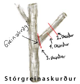 Þegar um er að ræða að fjarlægja stórar og þungar greinar er ráðlagt að gera það í þrem þrepum, eins og myndin sýnir.